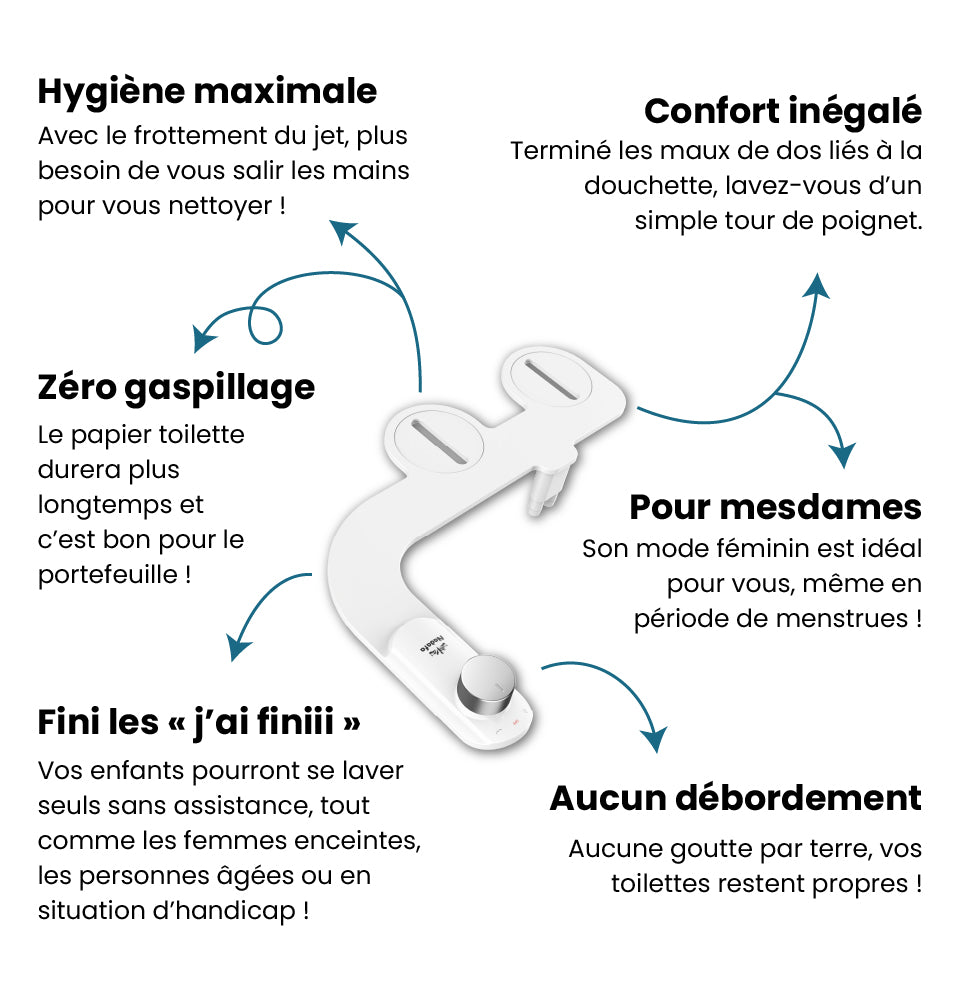 Fini les petits tracas au WC ! Avec le bidet Nadafa, propreté assurée, sans débordements ni mauvaises surprises.